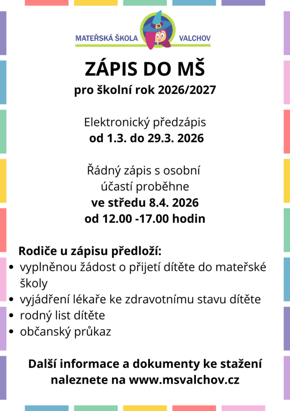 ZÁPIS DO MŠ PRO ŠKOLNÍ ROK 2026/2027 22 ledna, 202613 dubna, 2026 Pro elektronický předzápis odkaz ZDE